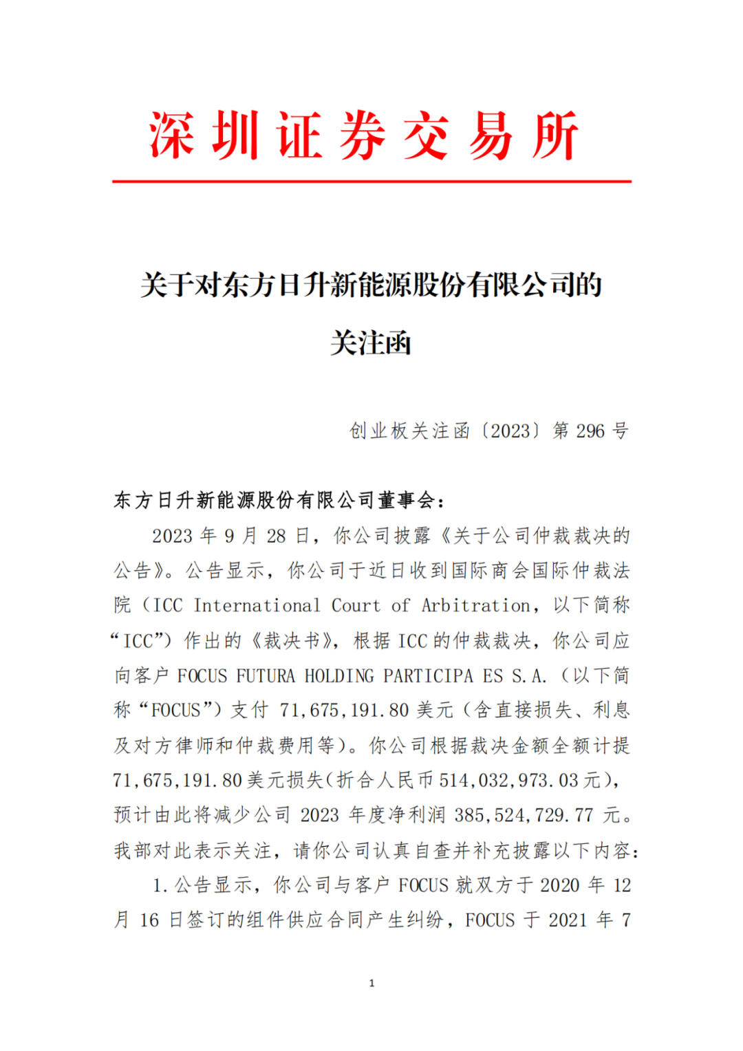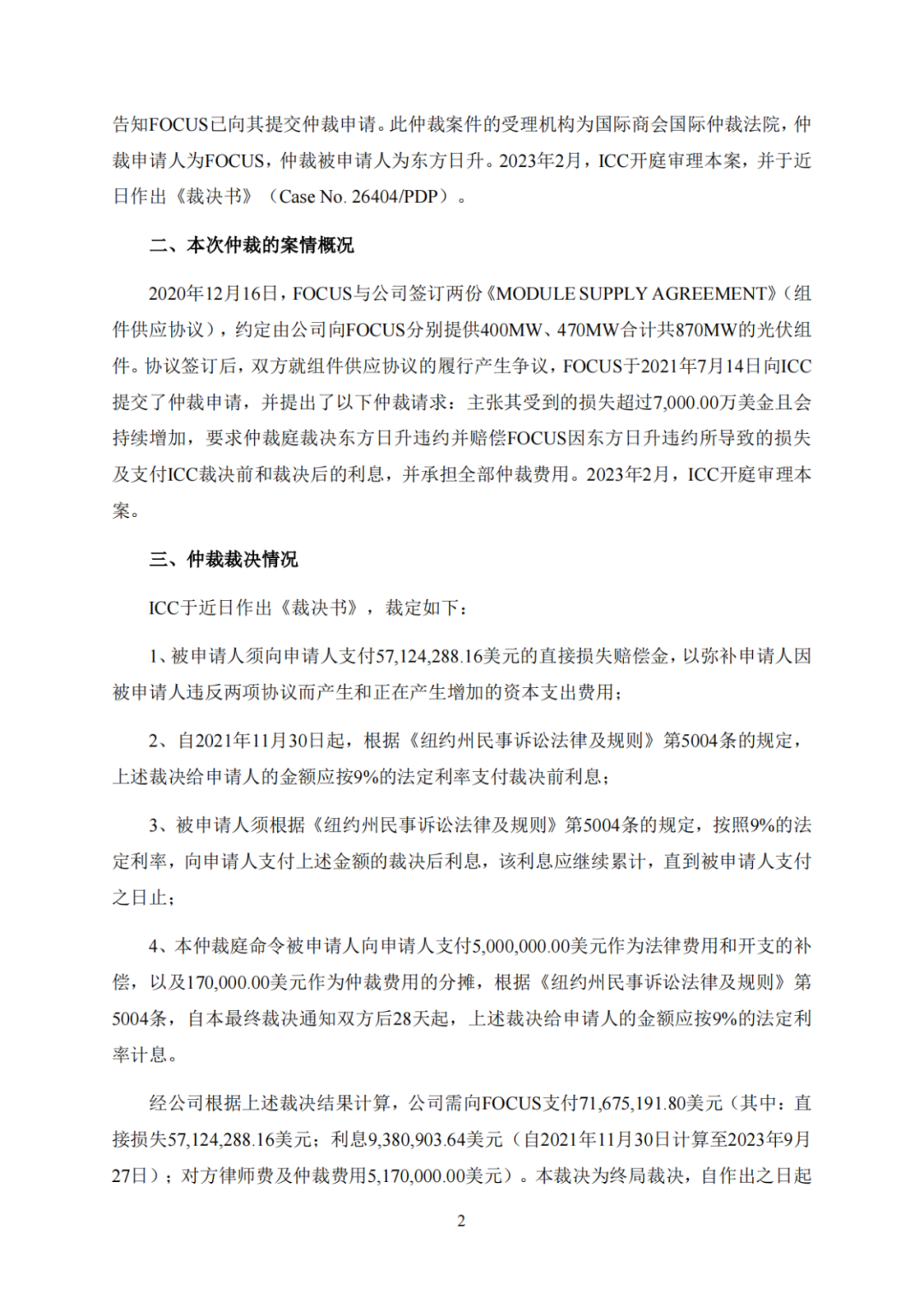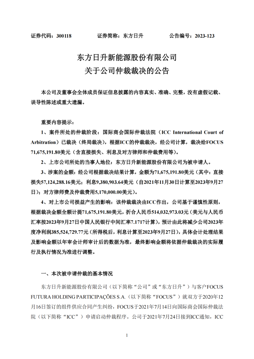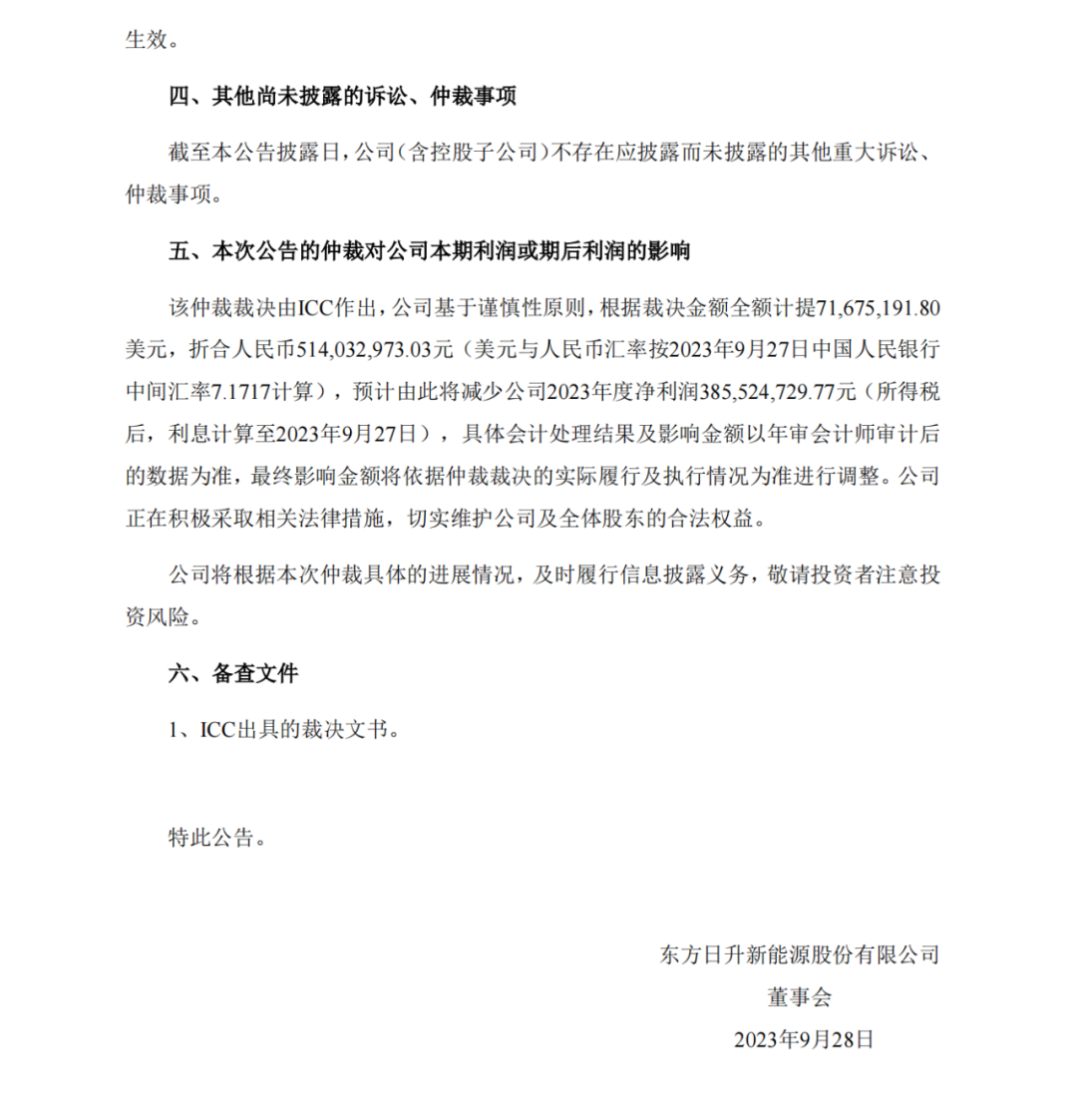 2023 年 9 月 28 日,东方日升发布《关于公司仲裁裁决的公告》称,收到ICC”的《裁决书》,需向客户“FOCUS”支付 71,675,191.80 美元(含直接损失、利息 及对方律师和仲裁费用等),因此要计提折合人民币5.14亿元损失, 预计 2023 年度净利润 3.855亿元。(公告原文附后)