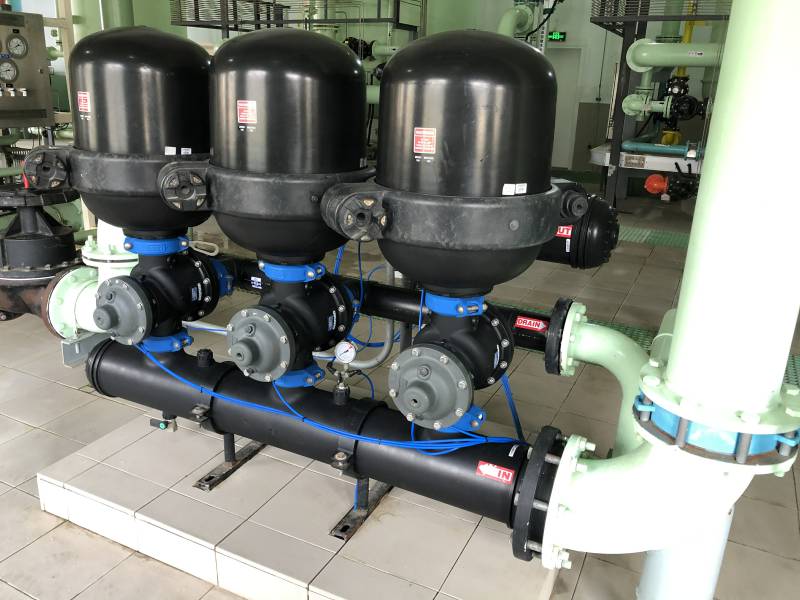 外源反冲流模式(ES):水由进水总管通过三通阀进入每个过滤单元,过滤的出水经过出水三通阀汇总到出水总管实现过滤,随着过滤的进行,当进出水压差或时间达到设定值时,PLC控制过滤系统进入反冲洗状态,控制系统首先发出信号给第一个单元对应的进出水两位三通阀,使两阀门改变方向,进水三通阀截断进水导通排污,出水三通阀截断出水导通外源水,反冲洗水由外源水管高速反冲洗第一过滤单元,并由排污口排出,反冲洗大约10-20秒后,第一过滤单元回到过滤状态,等待约几秒后,控制系统依次控制第二个及其以后的过滤单元进行反冲洗,等所有的过滤单元反冲洗后,过滤系统回到过滤状态。外源反冲洗模式应用于进水压力低,或过滤流量太小的应用点,或过滤单元数太少。建议采用泵或其他压力清洁水源作为反冲洗外源,反冲洗外源的压力和流量需要达到规定值以上。